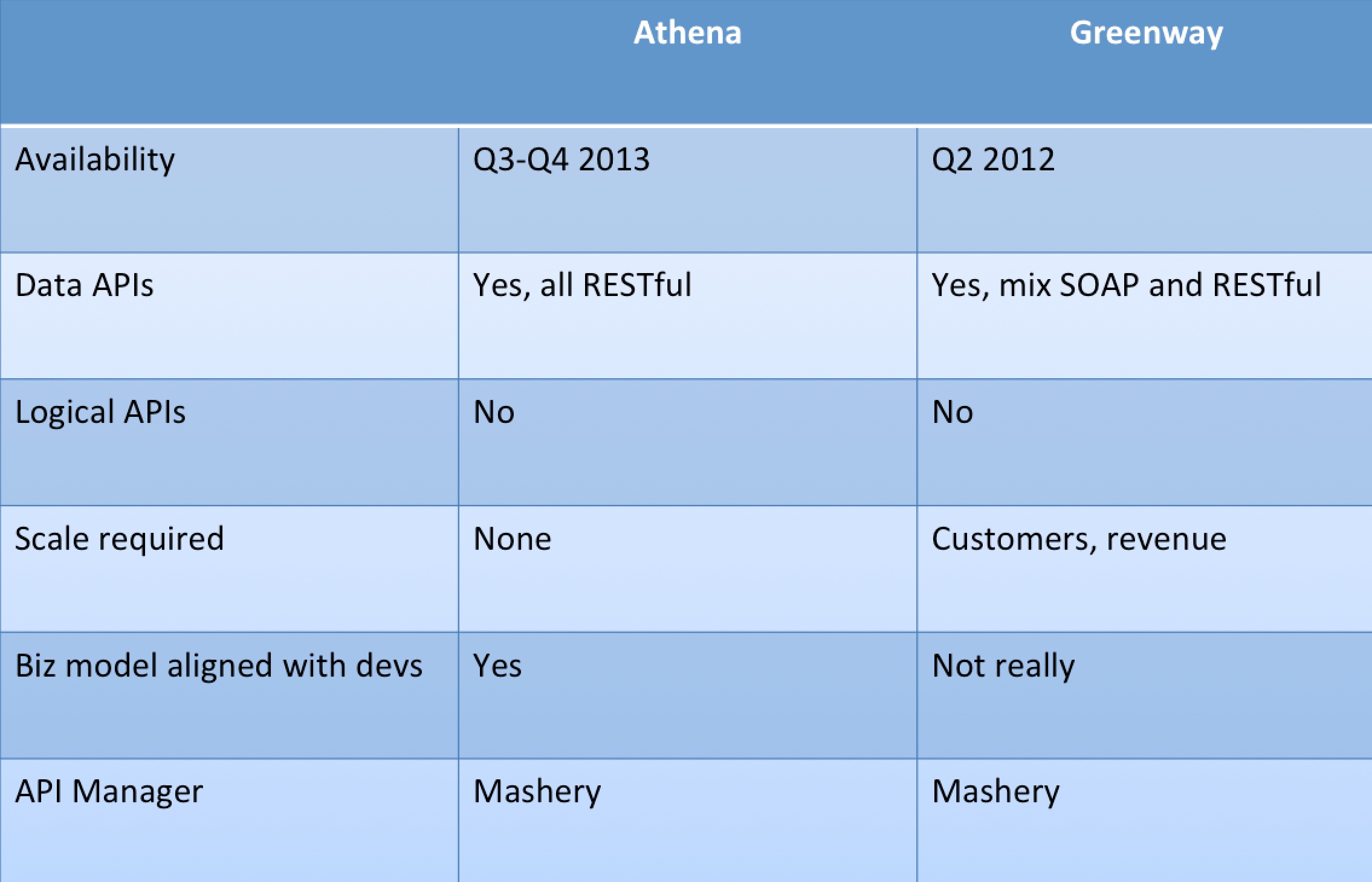 Both Greenway and Athena hired Mashery to help build their application platforms. Mashery helps technology companies build application platforms and expose APIs. It helps them make decisions about when and where to expose data, how to structure APIs, how to write documentation, and how to evangelize and entice developers to write on top of their platforms. Mashery is widely considered to be the best in the API management business, so it’s no surprise that both athena and Greenway turned to them. Neither company had experience building an application platform, so it was smart to bring in outside help.